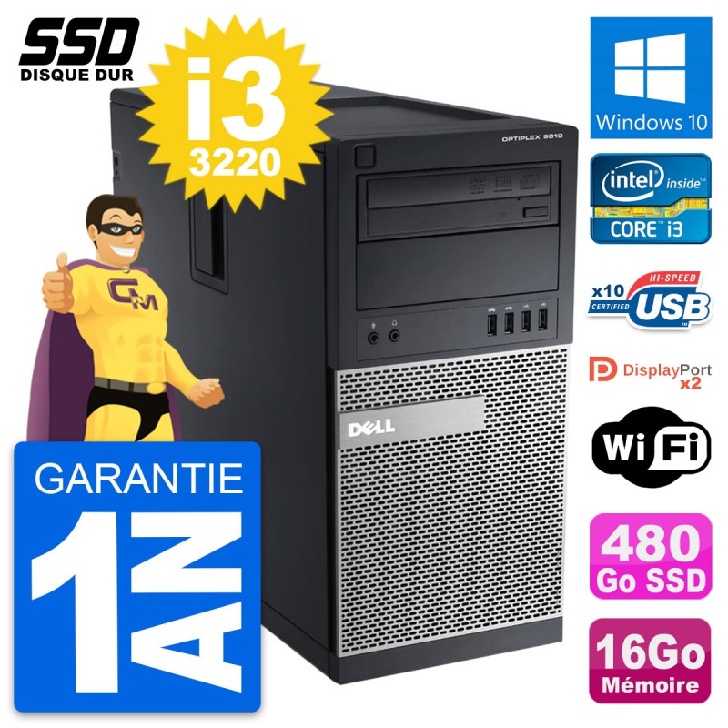 PC Tour Dell OptiPlex 9010 - Intel Core i3-3220 3.3 Ghz (3 Mo) - 16 Go DDR3 - SSD 480 Go - Graveur DVD - Clef Wifi USB - Windows 10 - Garantie 1 an.