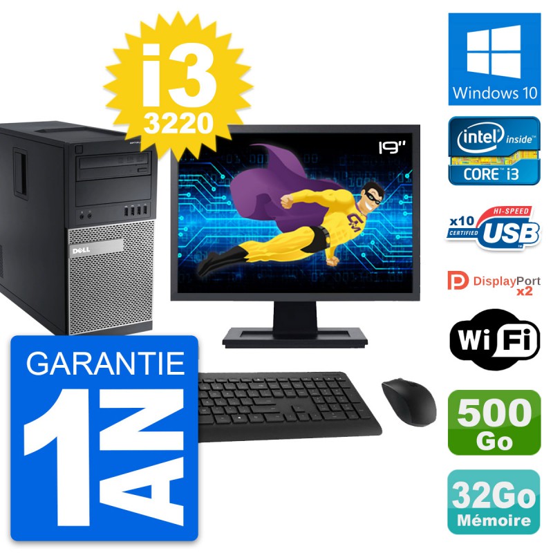 PC Tour Dell OptiPlex 9010 - Intel Core i3-3220 3.3 Ghz (3 Mo) - 32 Go DDR3 - Disque Dur 3,5" 500 Go - Graveur DVD - Clef Wifi USB - Windows 10 - Livré avec Ecran 19" + clavier + souris (Marques et modèles variables) - Garantie 1 an.