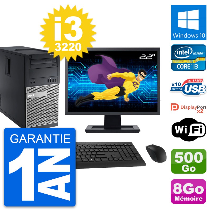 PC Tour Dell OptiPlex 9010 - Intel Core i3-3220 3.3 Ghz (3 Mo) - 8 Go DDR3 - Disque Dur 3,5" 500 Go - Graveur DVD - Clef Wifi USB - Windows 10 - Livré avec Ecran 22" + clavier + souris (Marques et modèles variables) - Garantie 1 an.