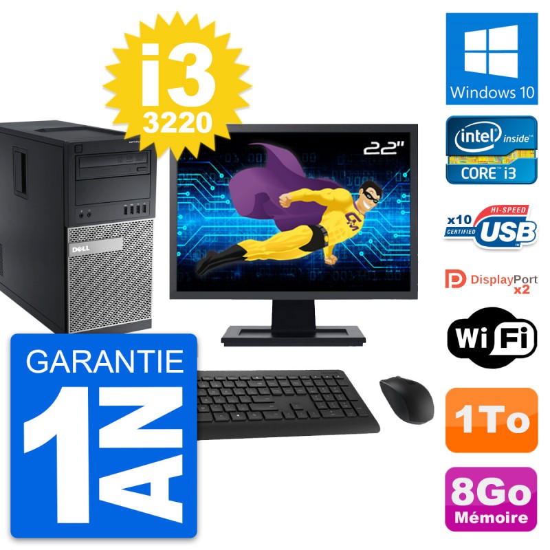 PC Tour Dell OptiPlex 9010 - Intel Core i3-3220 3.3 Ghz (3 Mo) - 8 Go DDR3 - Disque Dur 3,5" 1 To - Graveur DVD - Clef Wifi USB - Windows 10 - Livré avec Ecran 22" + clavier + souris (Marques et modèles variables) - Garantie 1 an.