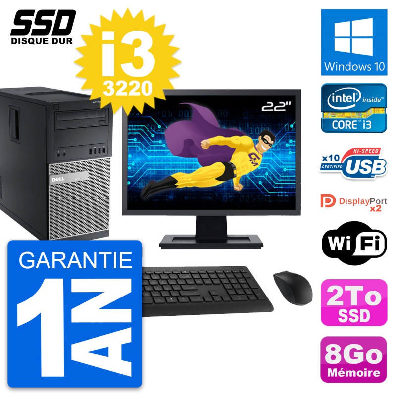 PC Tour Dell OptiPlex 9010 - Intel Core i3-3220 3.3 Ghz (3 Mo) - 8 Go DDR3 - SSD 2 To - Graveur DVD - Clef Wifi USB - Windows 10 - Livré avec Ecran 22" + clavier + souris (Marques et modèles variables) - Garantie 1 an.