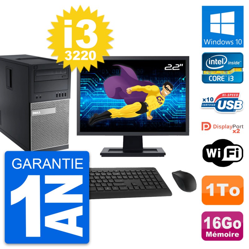 PC Tour Dell OptiPlex 9010 - Intel Core i3-3220 3.3 Ghz (3 Mo) - 16 Go DDR3 - Disque Dur 3,5" 1 To - Graveur DVD - Clef Wifi USB - Windows 10 - Livré avec Ecran 22" + clavier + souris (Marques et modèles variables) - Garantie 1 an.