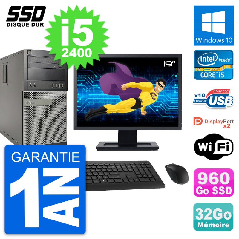 PC Tour Dell OptiPlex 9010 - Intel Core i5-2400 3.1 Ghz (6 Mo) - 32 Go DDR3 - SSD 960 Go - Graveur DVD - Clef Wifi USB - Windows 10 - Livré avec Ecran 19" + clavier + souris (Marques et modèles variables) - Garantie 1 an.