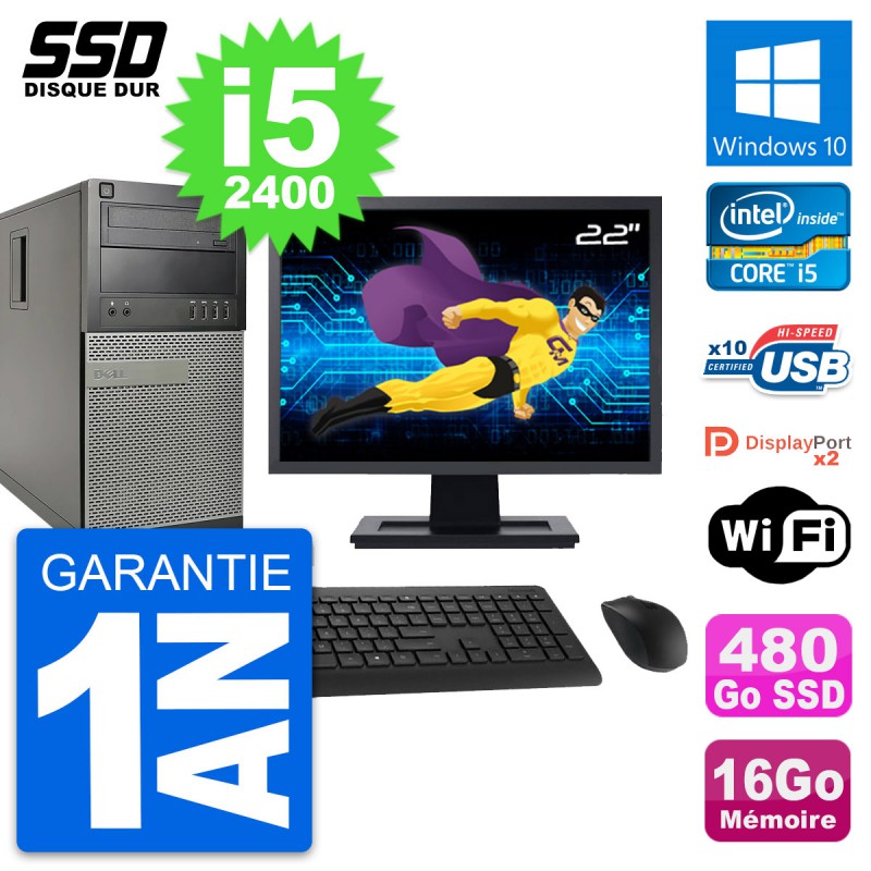PC Tour Dell OptiPlex 9010 - Intel Core i5-2400 3.1 Ghz (6 Mo) - 16 Go DDR3 - SSD 480 Go - Graveur DVD - Clef Wifi USB - Windows 10 - Livré avec Ecran 22" + clavier + souris (Marques et modèles variables) - Garantie 1 an.