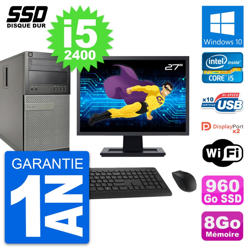 PC Tour Dell OptiPlex 9010 - Intel Core i5-2400 3.1 Ghz (6 Mo) - 8 Go DDR3 - SSD 960 Go - Graveur DVD - Clef Wifi USB - Windows 10 - Livré avec Ecran 27" + clavier + souris (Marques et modèles variables) - Garantie 1 an.