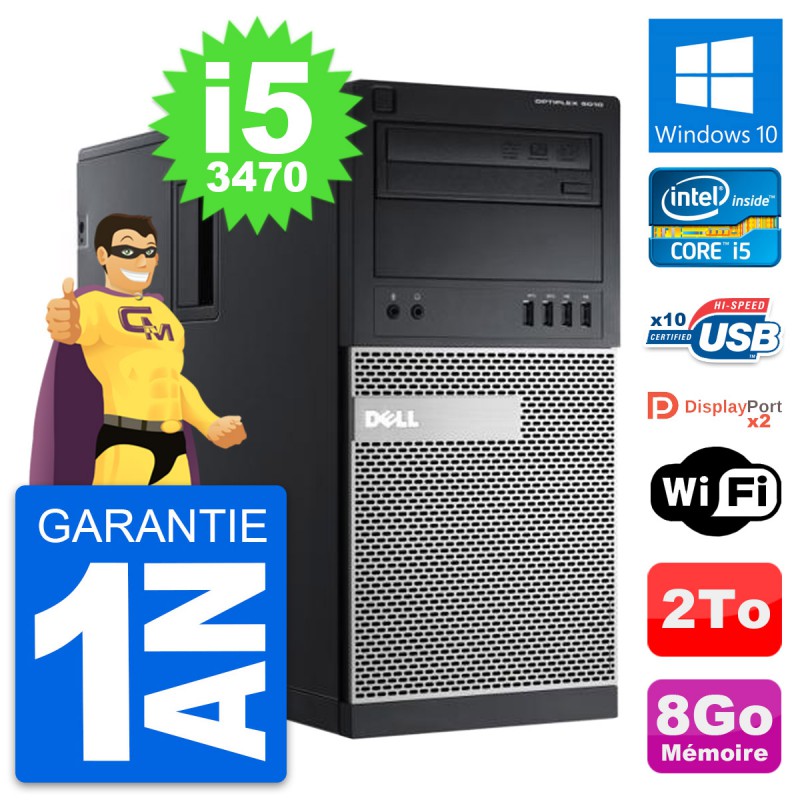 PC Tour Dell OptiPlex 9010 - Intel Core i5-3470 3.2 Ghz (6 Mo) - 8 Go DDR3 - Disque Dur 3,5" 2 To - Graveur DVD - Clef Wifi USB - Windows 10 - Garantie 1 an.