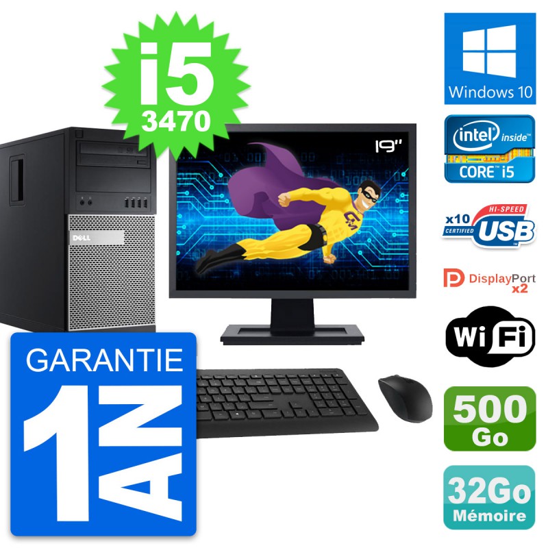 PC Tour Dell OptiPlex 9010 - Intel Core i5-3470 3.2 Ghz (6 Mo) - 32 Go DDR3 - Disque Dur 3,5" 500 Go - Graveur DVD - Clef Wifi USB - Windows 10 - Livré avec Ecran 19" + clavier + souris (Marques et modèles variables) - Garantie 1 an.