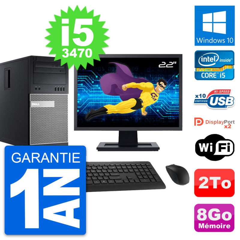 PC Tour Dell 9010 Ecran 22" Intel i5-3470 RAM 8Go Disque Dur 2To Windows 10 Wifi