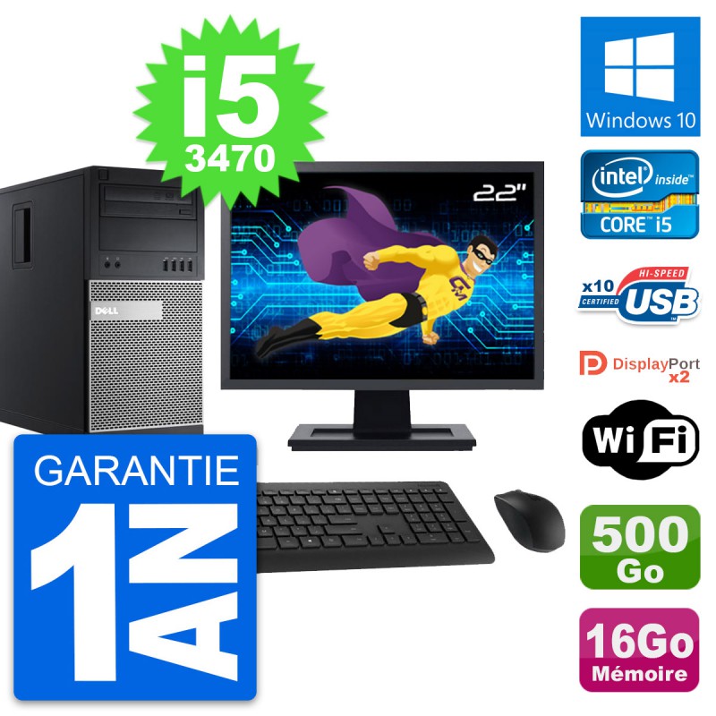 PC Tour Dell OptiPlex 9010 - Intel Core i5-3470 3.2 Ghz (6 Mo) - 16 Go DDR3 - Disque Dur 3,5" 500 Go - Graveur DVD - Clef Wifi USB - Windows 10 - Livré avec Ecran 22" + clavier + souris (Marques et modèles variables) - Garantie 1 an.