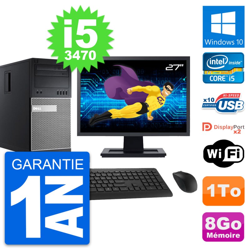 PC Tour Dell OptiPlex 9010 - Intel Core i5-3470 3.2 Ghz (6 Mo) - 8 Go DDR3 - Disque Dur 3,5" 1 To - Graveur DVD - Clef Wifi USB - Windows 10 - Livré avec Ecran 27" + clavier + souris (Marques et modèles variables) - Garantie 1 an.