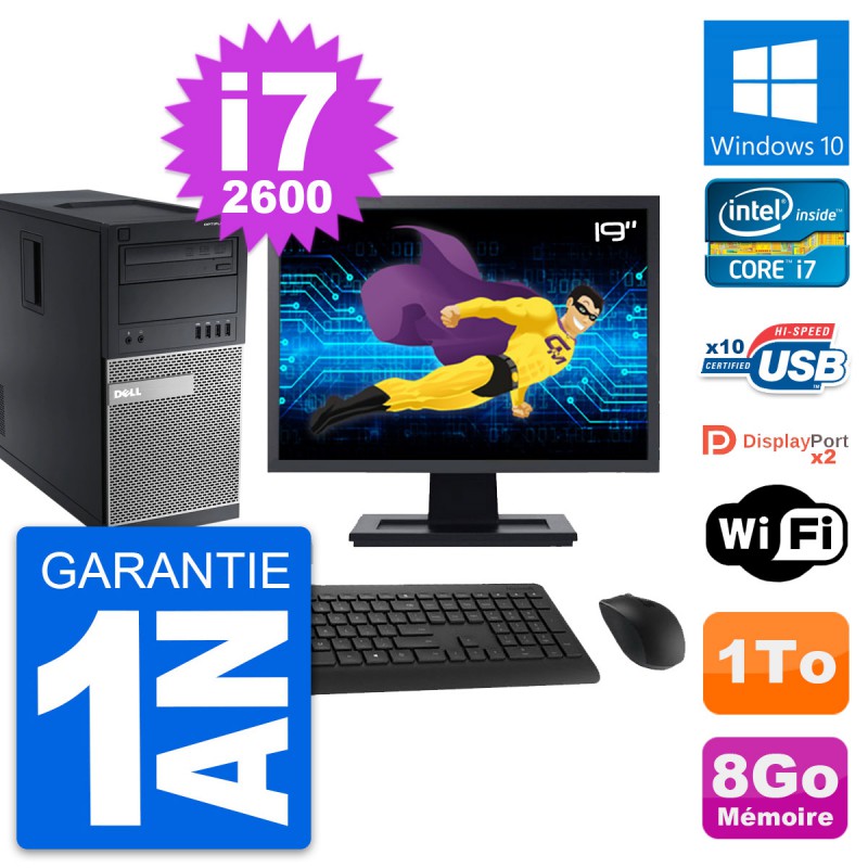 PC Tour Dell OptiPlex 9010 - Intel Core i7-2600 3.4 Ghz (8 Mo) - 8 Go DDR3 - Disque Dur 3,5" 1 To - Graveur DVD - Clef Wifi USB - Windows 10 - Livré avec Ecran 19" + clavier + souris (Marques et modèles variables) - Garantie 1 an.