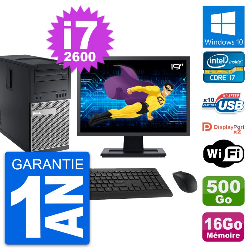 PC Tour Dell OptiPlex 9010 - Intel Core i7-2600 3.4 Ghz (8 Mo) - 16 Go DDR3 - Disque Dur 3,5" 500 Go - Graveur DVD - Clef Wifi USB - Windows 10 - Livré avec Ecran 19" + clavier + souris (Marques et modèles variables) - Garantie 1 an.