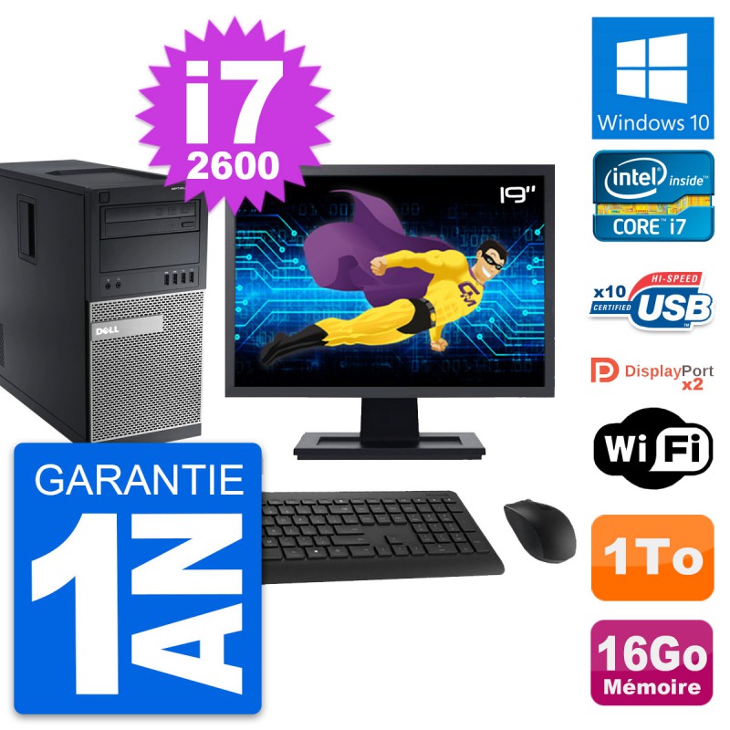 PC Tour Dell OptiPlex 9010 - Intel Core i7-2600 3.4 Ghz (8 Mo) - 16 Go DDR3 - Disque Dur 3,5" 1 To - Graveur DVD - Clef Wifi USB - Windows 10 - Livré avec Ecran 19" + clavier + souris (Marques et modèles variables) - Garantie 1 an.