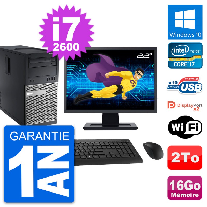PC Tour Dell OptiPlex 9010 - Intel Core i7-2600 3.4 Ghz (8 Mo) - 16 Go DDR3 - Disque Dur 3,5" 2 To - Graveur DVD - Clef Wifi USB - Windows 10 - Livré avec Ecran 22" + clavier + souris (Marques et modèles variables) - Garantie 1 an.