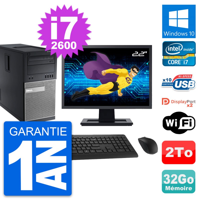 PC Tour Dell OptiPlex 9010 - Intel Core i7-2600 3.4 Ghz (8 Mo) - 32 Go DDR3 - Disque Dur 3,5" 2 To - Graveur DVD - Clef Wifi USB - Windows 10 - Livré avec Ecran 22" + clavier + souris (Marques et modèles variables) - Garantie 1 an.