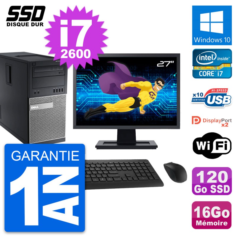 PC Tour Dell OptiPlex 9010 - Intel Core i7-2600 3.4 Ghz (8 Mo) - 16 Go DDR3 - SSD 120 Go - Graveur DVD - Clef Wifi USB - Windows 10 - Livré avec Ecran 27" + clavier + souris (Marques et modèles variables) - Garantie 1 an.