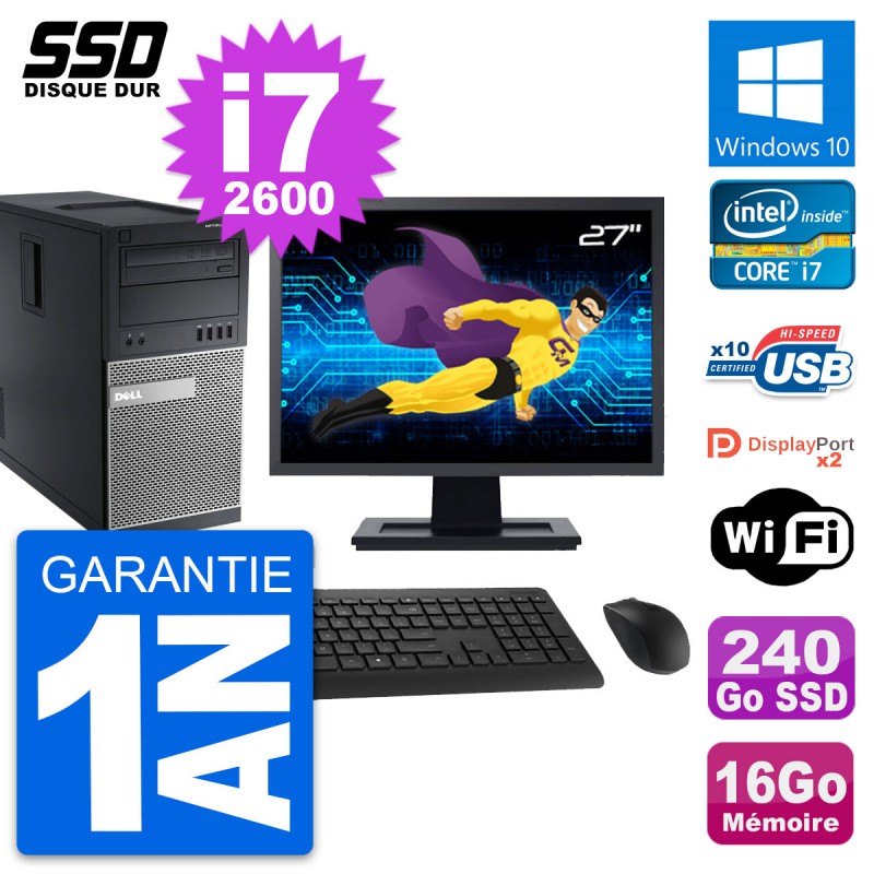 PC Tour Dell OptiPlex 9010 - Intel Core i7-2600 3.4 Ghz (8 Mo) - 16 Go DDR3 - SSD 240 Go - Graveur DVD - Clef Wifi USB - Windows 10 - Livré avec Ecran 27" + clavier + souris (Marques et modèles variables) - Garantie 1 an.
