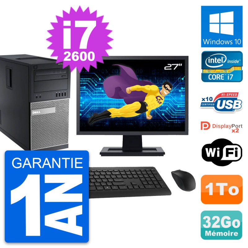 PC Tour Dell OptiPlex 9010 - Intel Core i7-2600 3.4 Ghz (8 Mo) - 32 Go DDR3 - Disque Dur 3,5" 1 To - Graveur DVD - Clef Wifi USB - Windows 10 - Livré avec Ecran 27" + clavier + souris (Marques et modèles variables) - Garantie 1 an.