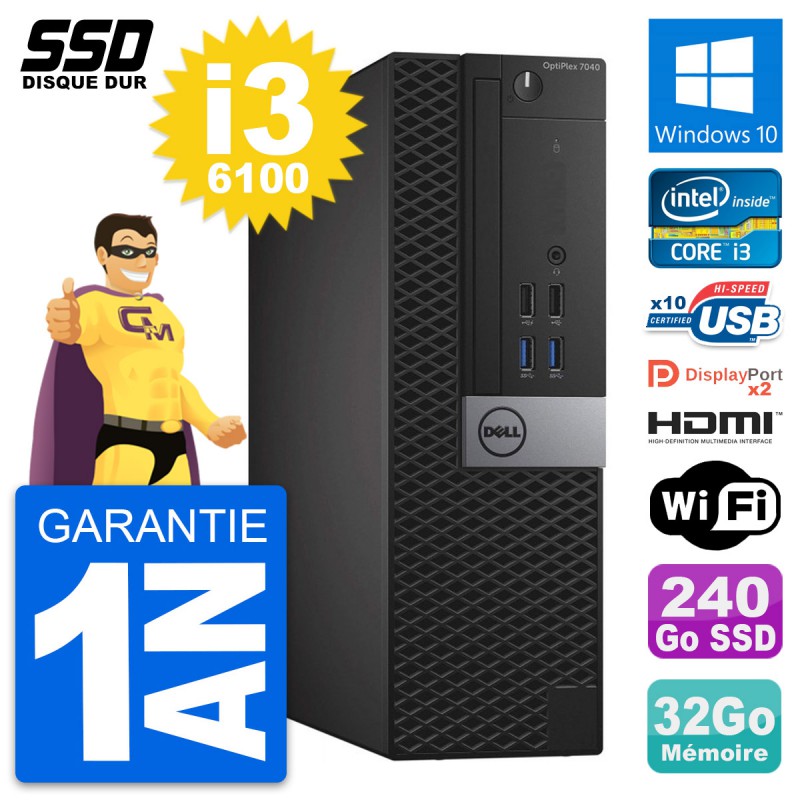 PC Dell OptiPlex 7040 SFF Core i3-6100 RAM 32Go SSD 240Go HDMI Windows 10 Wifi
