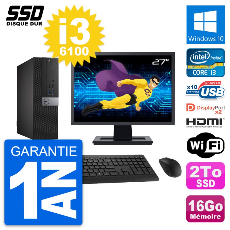 PC Dell OptiPlex 7040 SFF - Intel Core i3-6100 3.7 Ghz (3 Mo) - 16 Go DDR4 - SSD 2 To - Clef Wifi USB - Windows 10 - Livré avec Ecran 27" + clavier + souris (Marques et modèles variables) - Garantie 1 an.