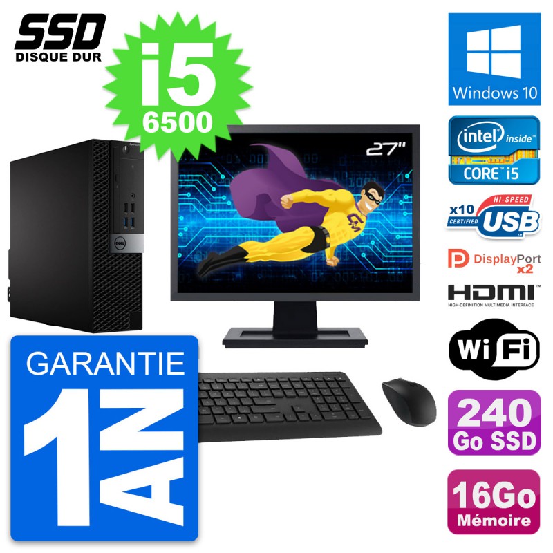 PC Dell OptiPlex 7040 SFF - Intel Core i5-6500 3.2 Ghz (6 Mo) - 16 Go DDR4 - SSD 240 Go - Clef Wifi USB - Windows 10 - Livré avec Ecran 27" + clavier + souris (Marques et modèles variables) - Garantie 1 an.