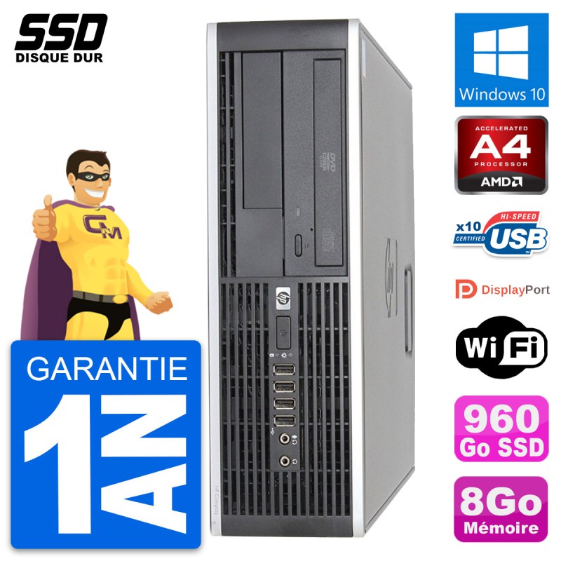 PC HP Compaq 6305 Pro SFF - AMD A4-Series A4-5300B 3.4 Ghz (1 Mo) - 8 Go DDR3 - SSD 960 Go - Graveur DVD - Clef Wifi USB - Windows 10 - Garantie 1 an.