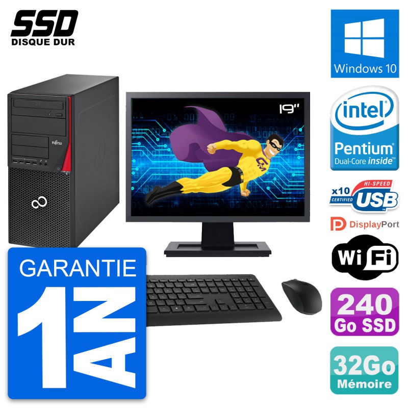 PC Tour Fujitsu Esprimo P720 - Intel Pentium Dual-Core G3220 3.0 Ghz (3 Mo) - 32 Go DDR3 - SSD 240 Go - Graveur DVD - Clef Wifi USB - Windows 10 - Livré avec Ecran 19" + clavier + souris (Marques et modèles variables) - Garantie 1 an.