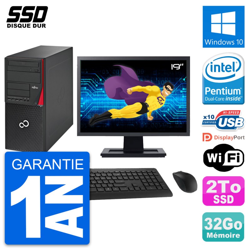 PC Tour Fujitsu Esprimo P720 - Intel Pentium Dual-Core G3220 3.0 Ghz (3 Mo) - 32 Go DDR3 - SSD 2 To - Graveur DVD - Clef Wifi USB - Windows 10 - Livré avec Ecran 19" + clavier + souris (Marques et modèles variables) - Garantie 1 an.