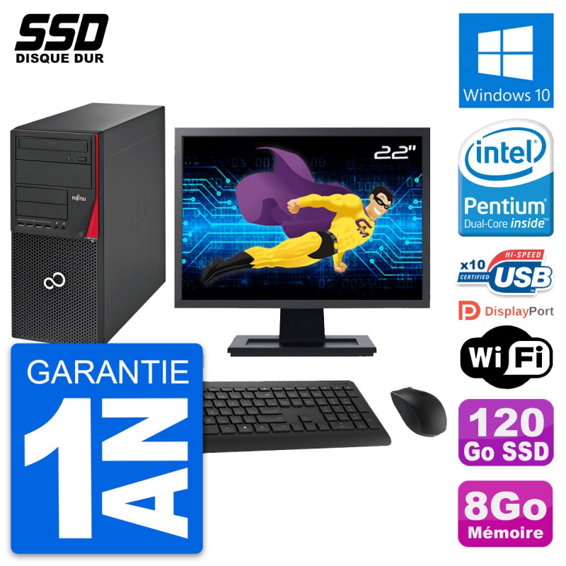 PC Tour Fujitsu Esprimo P720 - Intel Pentium Dual-Core G3220 3.0 Ghz (3 Mo) - 8 Go DDR3 - SSD 120 Go - Graveur DVD - Clef Wifi USB - Windows 10 - Livré avec Ecran 22" + clavier + souris (Marques et modèles variables) - Garantie 1 an.