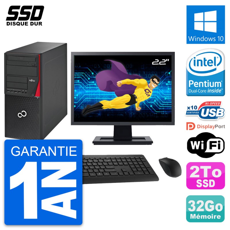 PC Tour Fujitsu Esprimo P720 - Intel Pentium Dual-Core G3220 3.0 Ghz (3 Mo) - 32 Go DDR3 - SSD 2 To - Graveur DVD - Clef Wifi USB - Windows 10 - Livré avec Ecran 22" + clavier + souris (Marques et modèles variables) - Garantie 1 an.