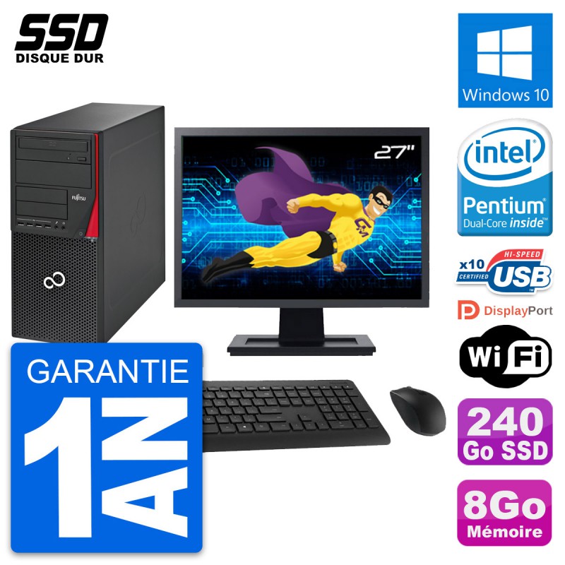 PC Tour Fujitsu Esprimo P720 - Intel Pentium Dual-Core G3220 3.0 Ghz (3 Mo) - 8 Go DDR3 - SSD 240 Go - Graveur DVD - Clef Wifi USB - Windows 10 - Livré avec Ecran 27" + clavier + souris (Marques et modèles variables) - Garantie 1 an.