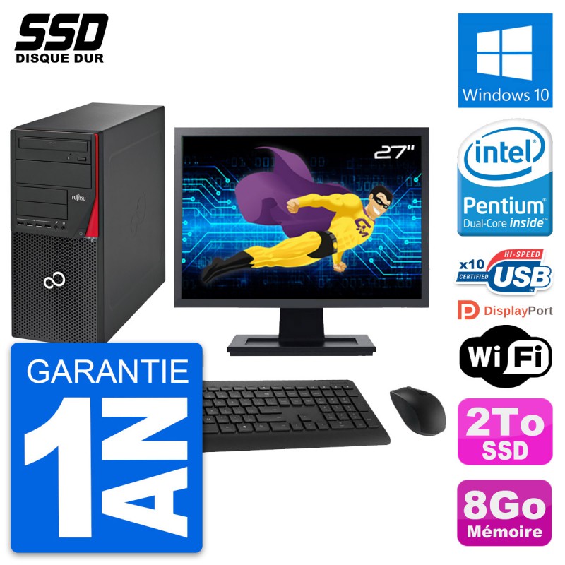 PC Tour Fujitsu Esprimo P720 - Intel Pentium Dual-Core G3220 3.0 Ghz (3 Mo) - 8 Go DDR3 - SSD 2 To - Graveur DVD - Clef Wifi USB - Windows 10 - Livré avec Ecran 27" + clavier + souris (Marques et modèles variables) - Garantie 1 an.