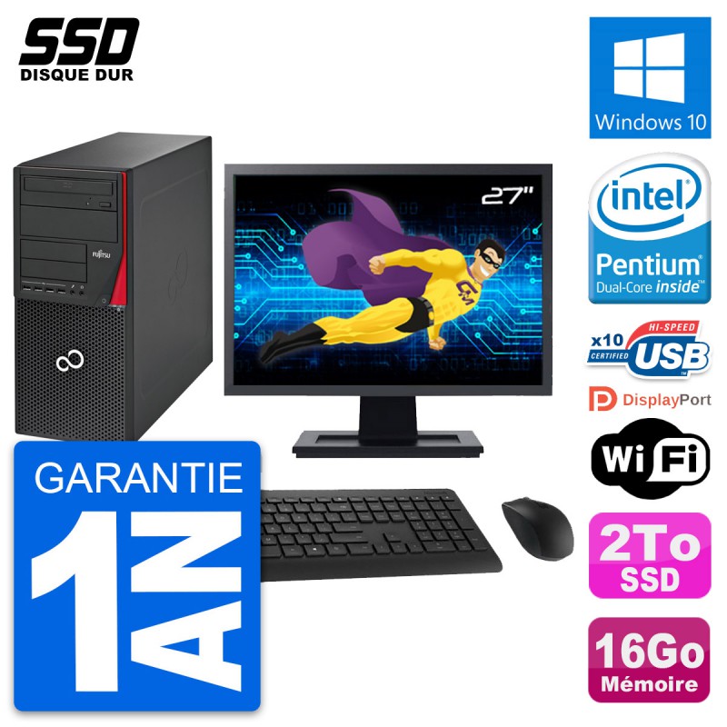 PC Tour Fujitsu Esprimo P720 - Intel Pentium Dual-Core G3220 3.0 Ghz (3 Mo) - 16 Go DDR3 - SSD 2 To - Graveur DVD - Clef Wifi USB - Windows 10 - Livré avec Ecran 27" + clavier + souris (Marques et modèles variables) - Garantie 1 an.