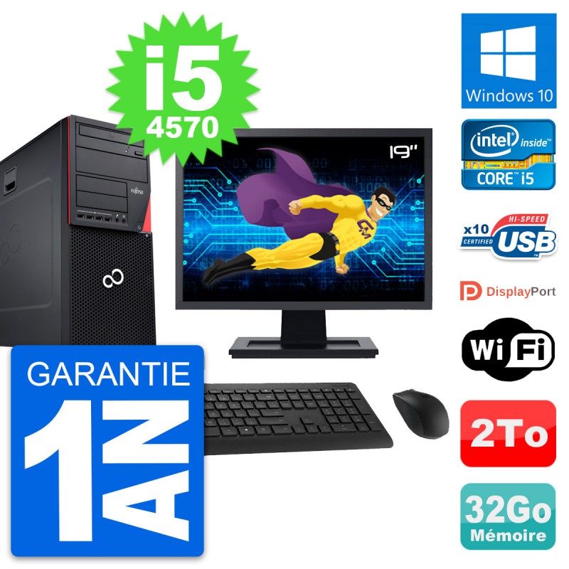 PC Tour Fujitsu Esprimo P720 - Intel Core i5-4570 3.2 Ghz (6 Mo) - 32 Go DDR3 - Disque Dur 3,5" 2 To - Graveur DVD - Clef Wifi USB - Windows 10 - Livré avec Ecran 19" + clavier + souris (Marques et modèles variables) - Garantie 1 an.