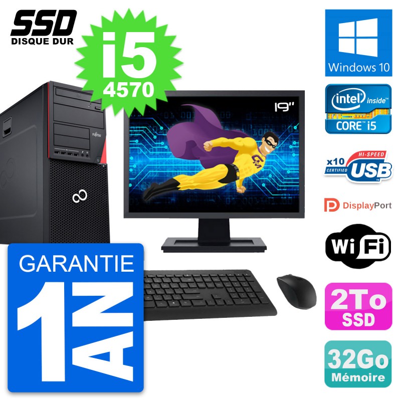 PC Tour Fujitsu Esprimo P720 - Intel Core i5-4570 3.2 Ghz (6 Mo) - 32 Go DDR3 - SSD 2 To - Graveur DVD - Clef Wifi USB - Windows 10 - Livré avec Ecran 19" + clavier + souris (Marques et modèles variables) - Garantie 1 an.