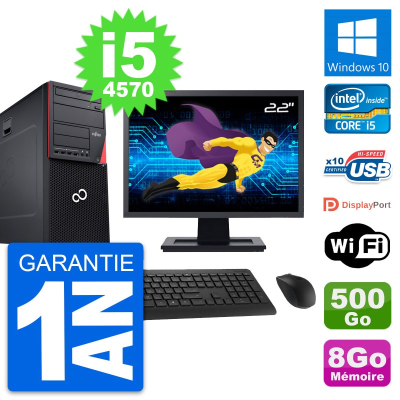 PC Tour Fujitsu Esprimo P720 - Intel Core i5-4570 3.2 Ghz (6 Mo) - 8 Go DDR3 - Disque Dur 3,5" 500 Go - Graveur DVD - Clef Wifi USB - Windows 10 - Livré avec Ecran 22" + clavier + souris (Marques et modèles variables) - Garantie 1 an.