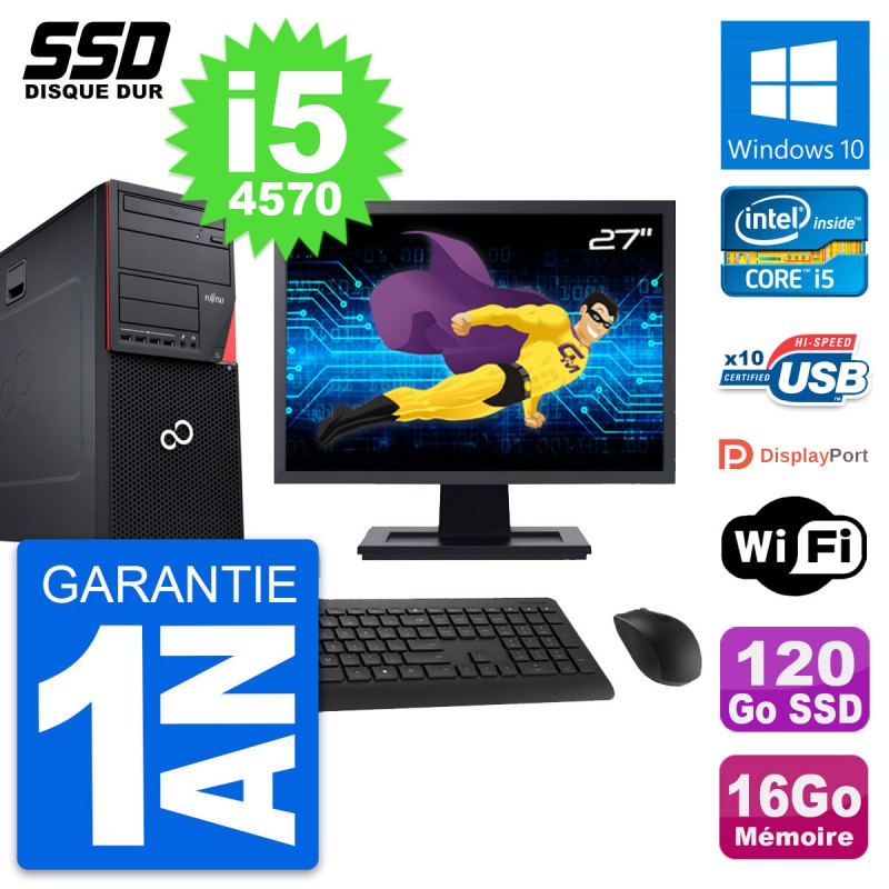 PC Tour Fujitsu Esprimo P720 - Intel Core i5-4570 3.2 Ghz (6 Mo) - 16 Go DDR3 - SSD 120 Go - Graveur DVD - Clef Wifi USB - Windows 10 - Livré avec Ecran 27" + clavier + souris (Marques et modèles variables) - Garantie 1 an.