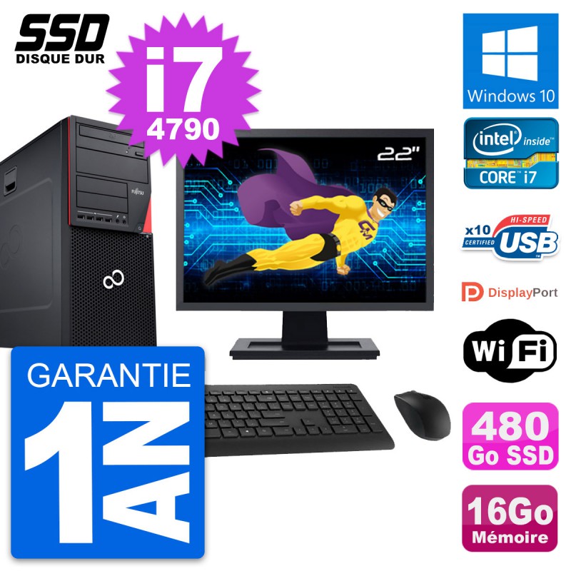 PC Tour Fujitsu Esprimo P720 - Intel Core i7-4790 3.6 Ghz (8 Mo) - 16 Go DDR3 - SSD 480 Go - Graveur DVD - Clef Wifi USB - Windows 10 - Livré avec Ecran 22" + clavier + souris (Marques et modèles variables) - Garantie 1 an.