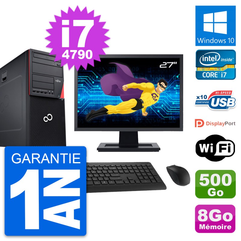 PC Tour Fujitsu Esprimo P720 - Intel Core i7-4790 3.6 Ghz (8 Mo) - 8 Go DDR3 - Disque Dur 3,5" 500 Go - Graveur DVD - Clef Wifi USB - Windows 10 - Livré avec Ecran 27" + clavier + souris (Marques et modèles variables) - Garantie 1 an.