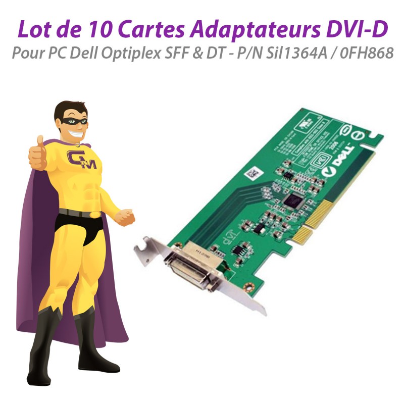Lot de 10 Cartes Adaptateurs DVI-D - Dell - P/N Sil1364A / 0FH868 / FH868 - PCI-Express x16 - Low Profile (équerre courte) - Pour PC Dell Optiplex format DeskTop (DT) et Slim (SFF) - Garantis 6 mois.