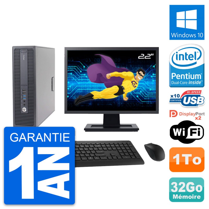 PC HP ProDesk 600 G2 SFF - Intel Pentium Dual-Core G4400 3.3 Ghz (3 Mo) - 32 Go DDR4 - Disque Dur 3,5" 1 To - Clef Wifi USB - Windows 10 - Livré avec Ecran 22" + clavier + souris (Marques et modèles variables) - Garantie 1 an.