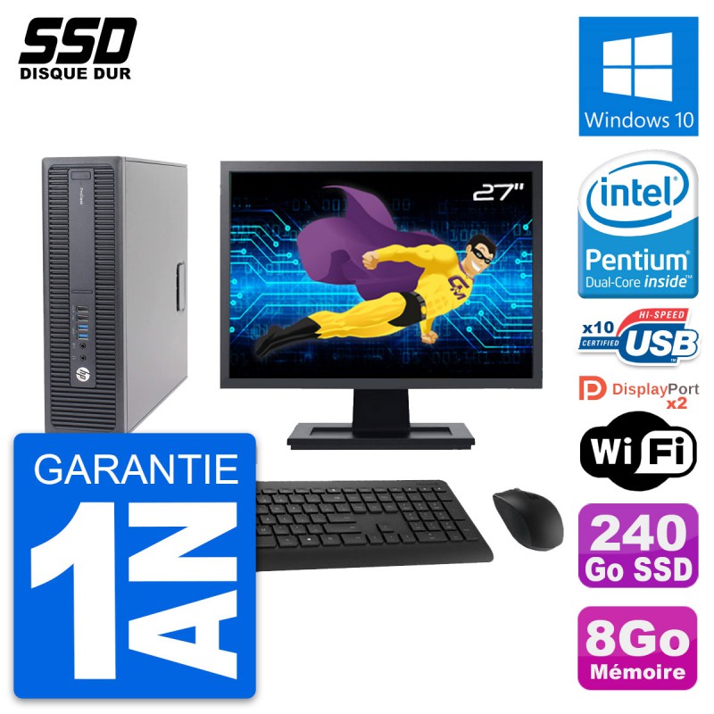 PC HP ProDesk 600 G2 SFF - Intel Pentium Dual-Core G4400 3.3 Ghz (3 Mo) - 8 Go DDR4 - SSD 240 Go - Clef Wifi USB - Windows 10 - Livré avec Ecran 27" + clavier + souris (Marques et modèles variables) - Garantie 1 an.