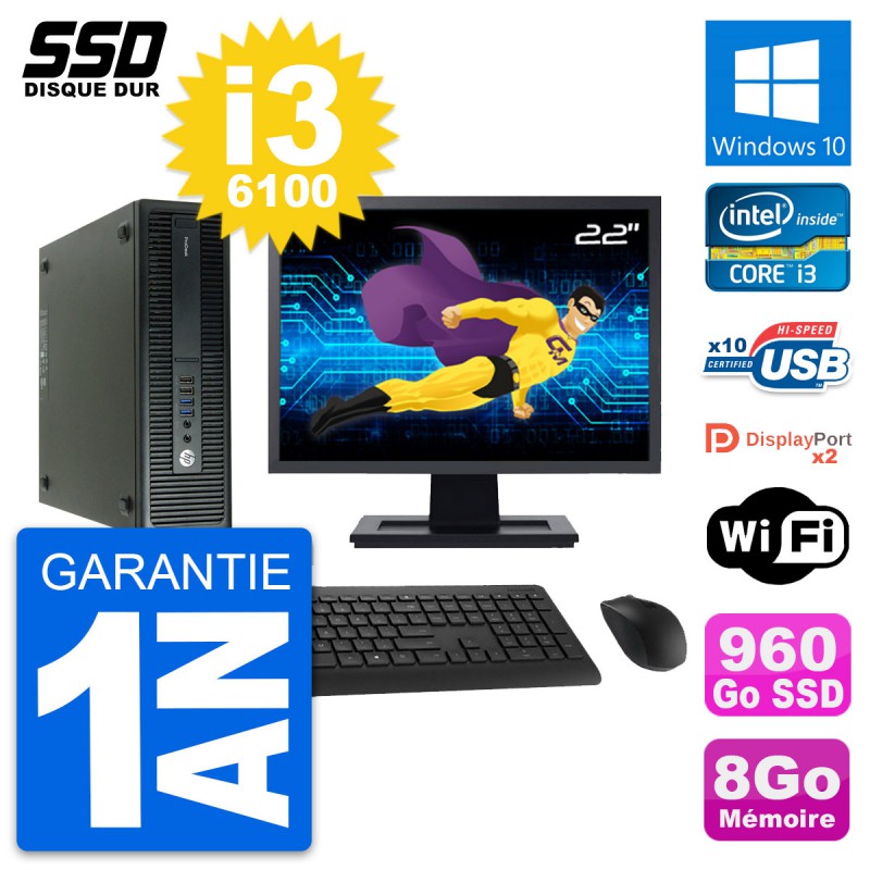 PC HP ProDesk 600 G2 SFF - Intel Core i3-6100 3.7 Ghz (3 Mo) - 8 Go DDR4 - SSD 960 Go - Clef Wifi USB - Windows 10 - Livré avec Ecran 22" + clavier + souris (Marques et modèles variables) - Garantie 1 an.