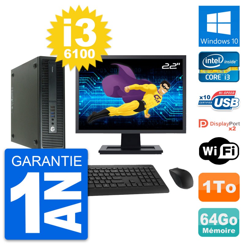 PC HP 600 G2 SFF Ecran 22" Intel i3-6100 RAM 64Go Disque Dur 1To Windows 10 Wifi