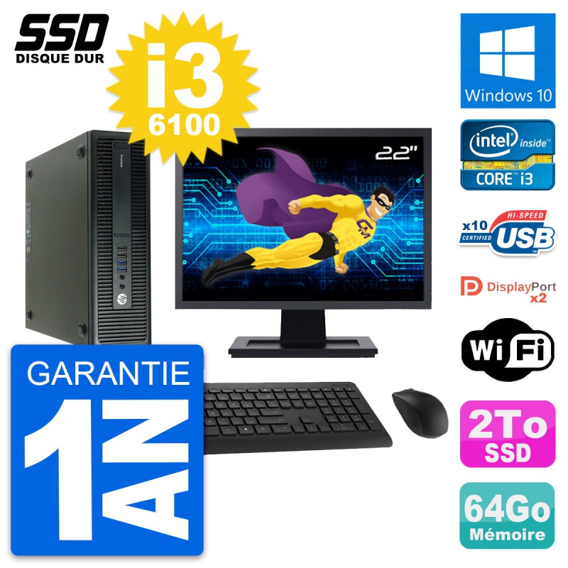 PC HP ProDesk 600 G2 SFF - Intel Core i3-6100 3.7 Ghz (3 Mo) - 64 Go DDR4 - SSD 2 To - Clef Wifi USB - Windows 10 - Livré avec Ecran 22" + clavier + souris (Marques et modèles variables) - Garantie 1 an.