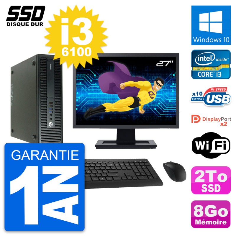 PC HP ProDesk 600 G2 SFF - Intel Core i3-6100 3.7 Ghz (3 Mo) - 8 Go DDR4 - SSD 2 To - Clef Wifi USB - Windows 10 - Livré avec Ecran 27" + clavier + souris (Marques et modèles variables) - Garantie 1 an.