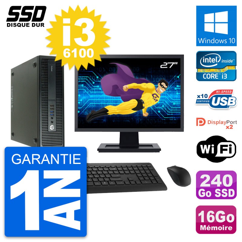PC HP ProDesk 600 G2 SFF - Intel Core i3-6100 3.7 Ghz (3 Mo) - 16 Go DDR4 - SSD 240 Go - Clef Wifi USB - Windows 10 - Livré avec Ecran 27" + clavier + souris (Marques et modèles variables) - Garantie 1 an.