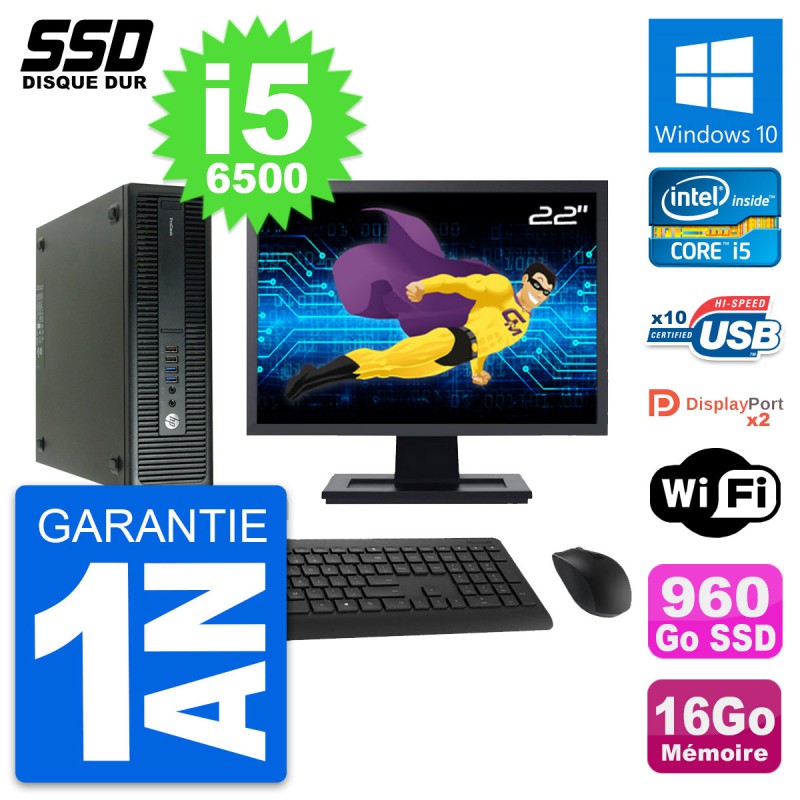 PC HP ProDesk 600 G2 SFF - Intel Core i5-6500 3.2 Ghz (6 Mo) - 16 Go DDR4 - SSD 960 Go - Clef Wifi USB - Windows 10 - Livré avec Ecran 22" + clavier + souris (Marques et modèles variables) - Garantie 1 an.