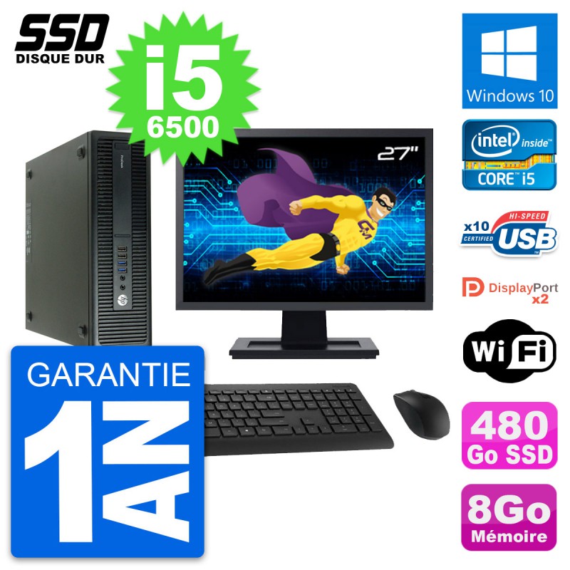 PC HP ProDesk 600 G2 SFF - Intel Core i5-6500 3.2 Ghz (6 Mo) - 8 Go DDR4 - SSD 480 Go - Clef Wifi USB - Windows 10 - Livré avec Ecran 27" + clavier + souris (Marques et modèles variables) - Garantie 1 an.