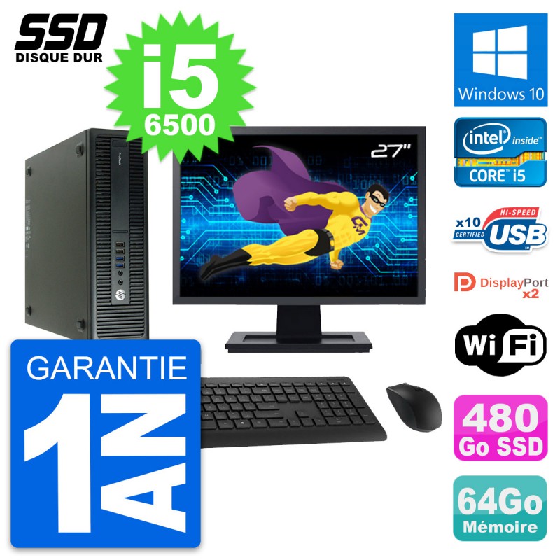 PC HP ProDesk 600 G2 SFF - Intel Core i5-6500 3.2 Ghz (6 Mo) - 64 Go DDR4 - SSD 480 Go - Clef Wifi USB - Windows 10 - Livré avec Ecran 27" + clavier + souris (Marques et modèles variables) - Garantie 1 an.